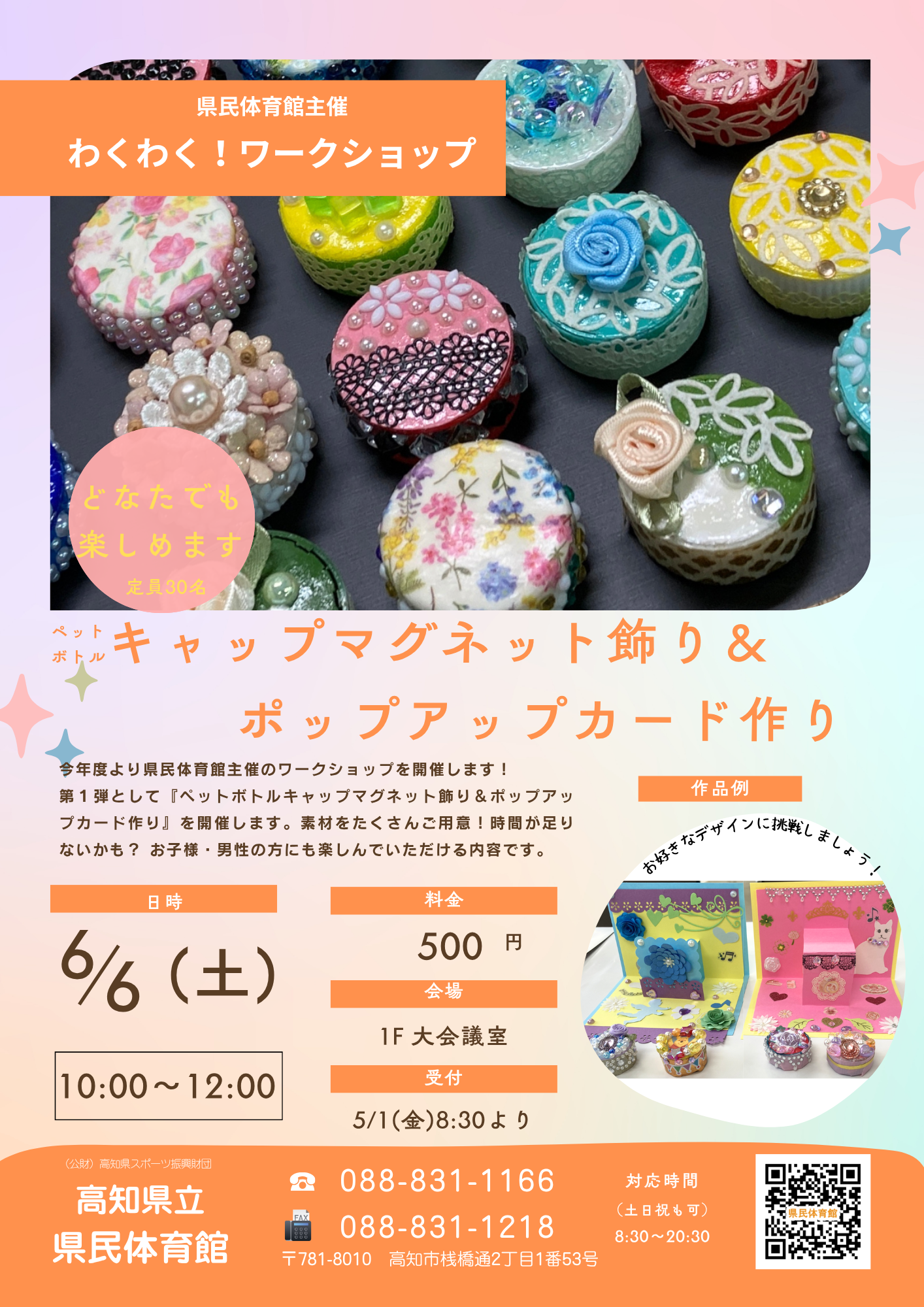 県民体育館の大会議室で「ペットボトルキャップマグネット飾り&ポップアップカード作り」のワークショップを開催します。